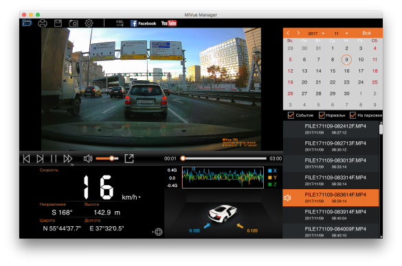 Видео, записанное MIO MiVue 765 можно просматривать как при помощи любого видеоплеера, так и с помощью специального софта – MiVue Manager. С помощью этого софта можно легко сортировать ролики по дате записи, а также узнать записанные показания G-сенсора и посмотреть путь на Google Maps.