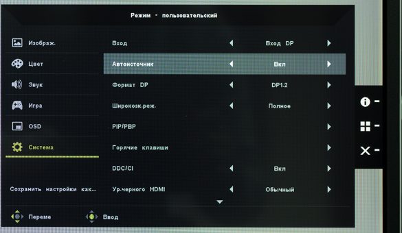 Меню у ACER ET430K получилось простым и понятным. Управляться с ним можно с помощью 5-позиционного джойстика, что очень удобно. В меню доступны как обычные настройки картинки, вроде яркости и контрастности, так и продвинутые опции, вроде глубины чёрного, фильтра синего света и резкость картинки. Также можно настроить усиление и смещение цвета по шести осям (RGB для смещения и RGB для усиления).