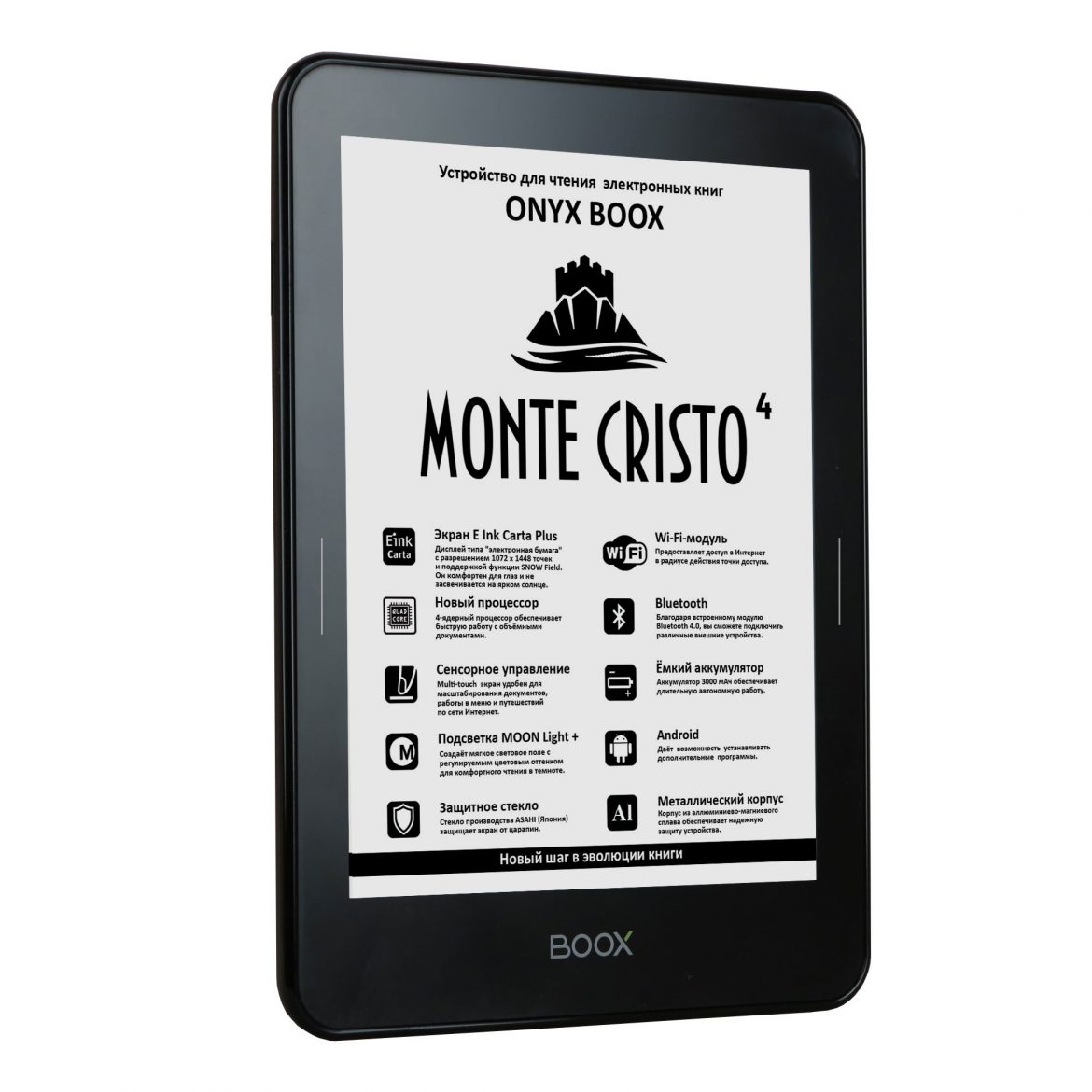 На российский рынок поступила новая модель букридера ONYX BOOX Monte Cristo 4 премиального уровня. Устройство работает на 4-х ядерном процессоре с ОЗУ 1 Гб, под управлением ОС Android 4.4. Обновилась функция MOON Light+ теперь регулировать параметры чтения стало значительно удобнее.